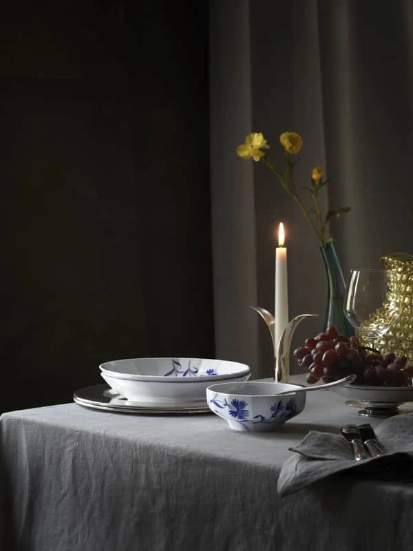 Royal Copenhagen har taget en moderne drejning på det klassiske blå blomstermotiv. Den blå rose står i kontrast til det kridhvide porcelæn, og får lov til at gro frit på tallerkenens bløde coupé-form. Den asymmetriske placering af blomsten skaber et moderne udtryk og giver din borddækning en moderne twist.