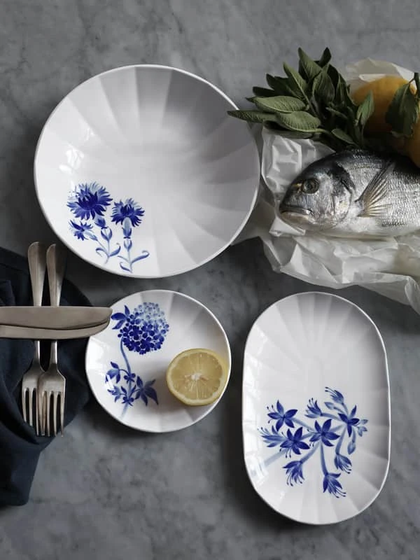 Med en særlig tanke til det historiske Blå Blomst stel har Royal Copenhagen skabt det moderne og sofistikerede Blomst-stel. Det ovale fad med sin kantede form er dekoreret af en frodig funkia, som får lov at blomstre hen over porcelænets hvide overflade. Fadet står på en næsten usynlig søjlefod, så det næsten svæver over middagsbordet.