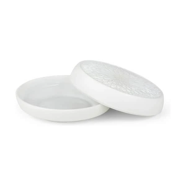 Bonbonnieren er bisquitbrændt, hvilket betyder at den er tætbrændt uden glasur. Det gør, at bonbonnieren har en let ru hvid overflade, som gør den modtagelig for mørkt smuds. Trænger din fine bonbonniere til at blive ren, kan du nemt fjerne snavs og afsmitning med vand og mild sæbe.
