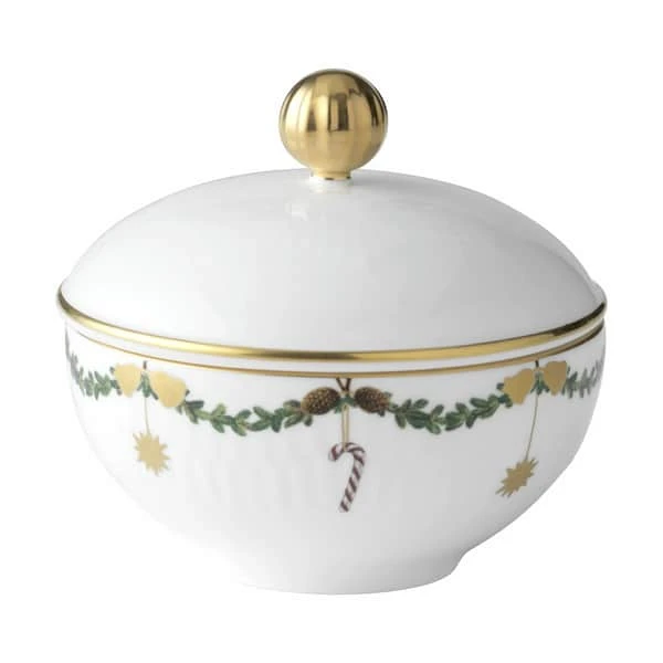 Sukkerskålen fra Royal Copenhagens julestel kan holde på alle julens lækkerier. Tag låget af og nap et lille stykke konfekt. Mums!