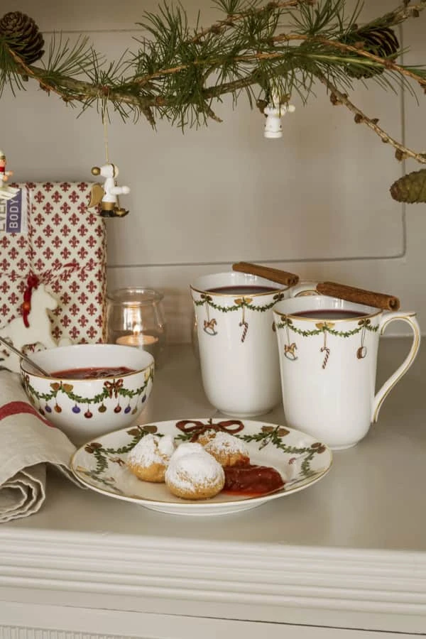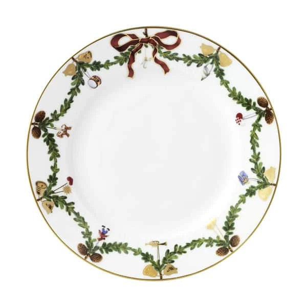 Dæk et smukt julebord til julefrokosten med Royal Copenhagens julestel. På den smukke tallerken hænger kransen langs kantens fyldt med juledekorationer. En smuk juleopdækning kan bare noget.